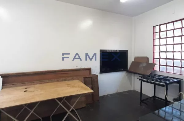 Salão de festas com churrasqueira, cozinha.