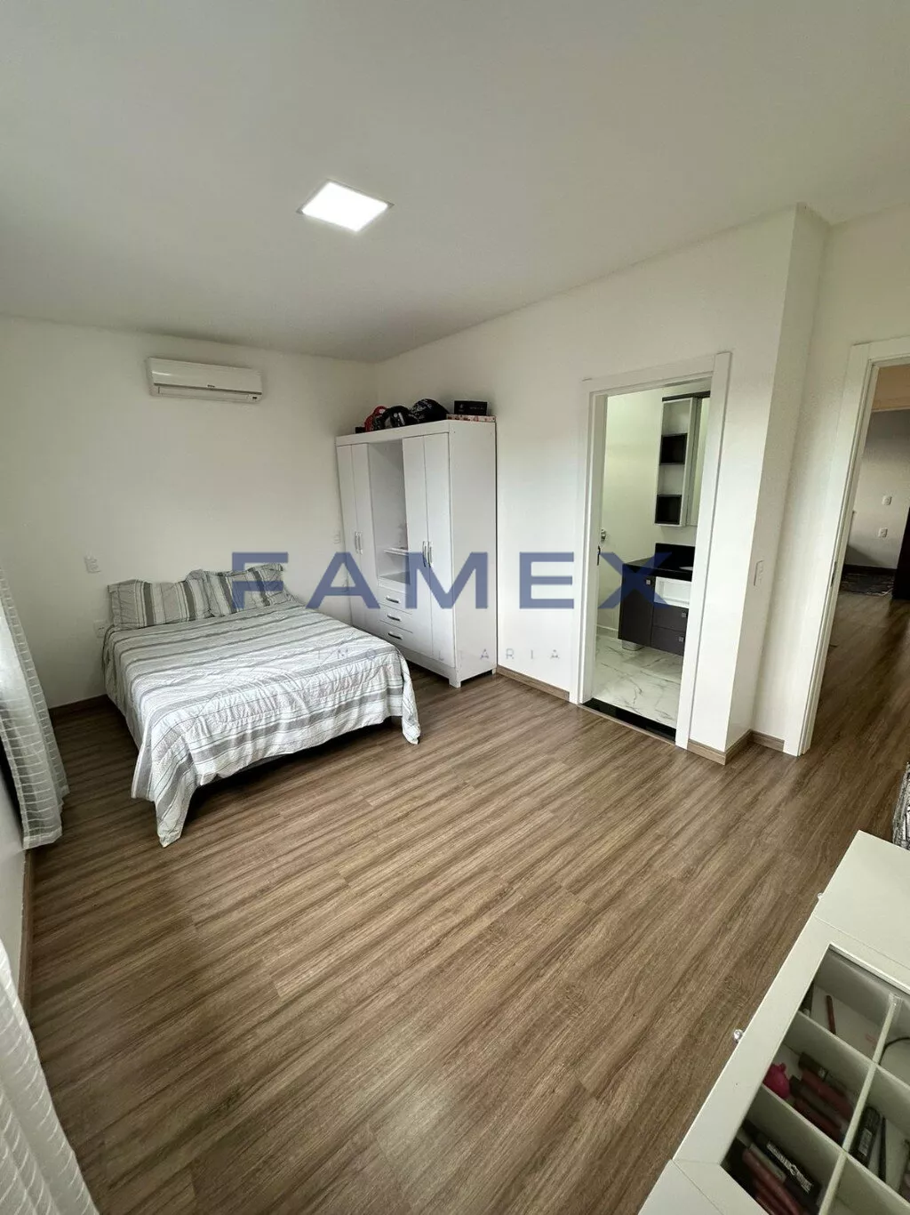 Uma suíte máster com closet e sacada.