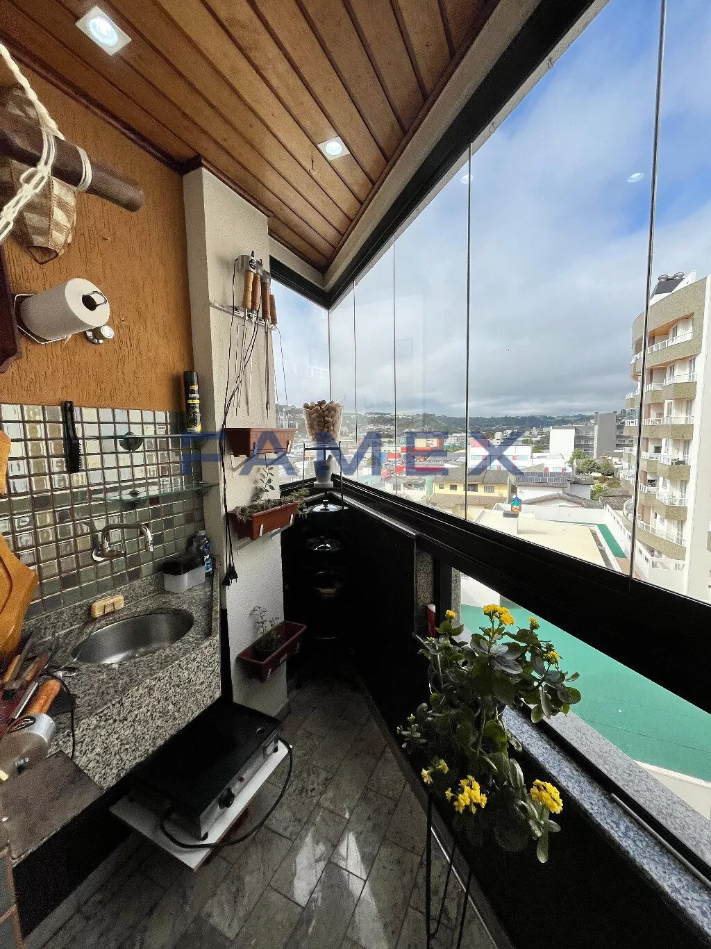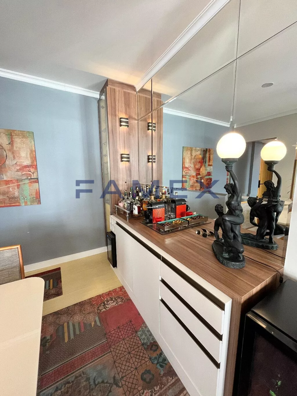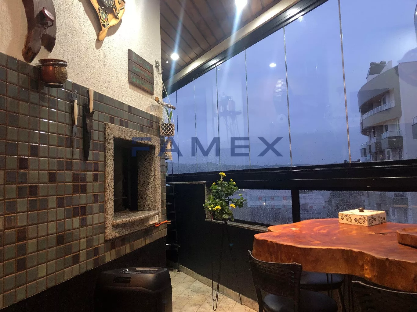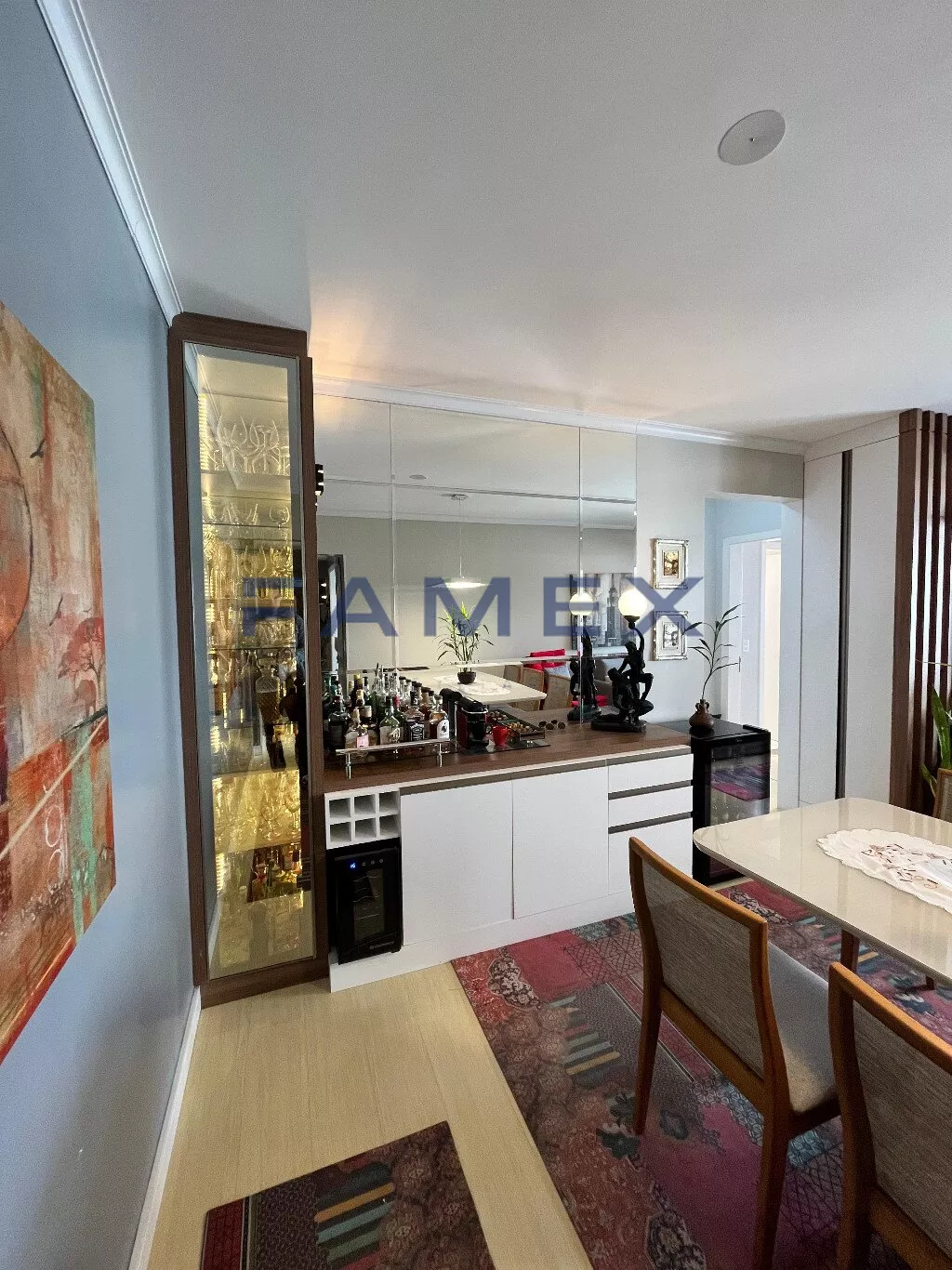 O imóvel possui uma suíte climatizada, totalmente mobiliada com roupeiro planejado até o teto, sapateira com prateleiras e gavetas corrediças, guarda de cama com armários até o teto, cama queen com base box baú, banheiros com blindex e aquecimento central, quarto com armário até o teto, cama de casal basculante, prateleiras e uma bancada de trabalho, sala de dois ambientes com móveis planejados, balcão com duas portas e três gavetas, cristaleira com iluminação em led, adega climatizada, rack de tv com quatro gavetas com acabamento em vidro, varanda gourmet com churrasqueira a carvão, bancada de apoio com pia, fechamento da sacada com sistema reiki, cozinha com móveis planejados, torre quente, bancadas em granito e aquecimento central, área de serviço também com móveis planejados, tanque de inóx e aquecimento e bancada em granito, fechadura eletrônica na porta de entrada.